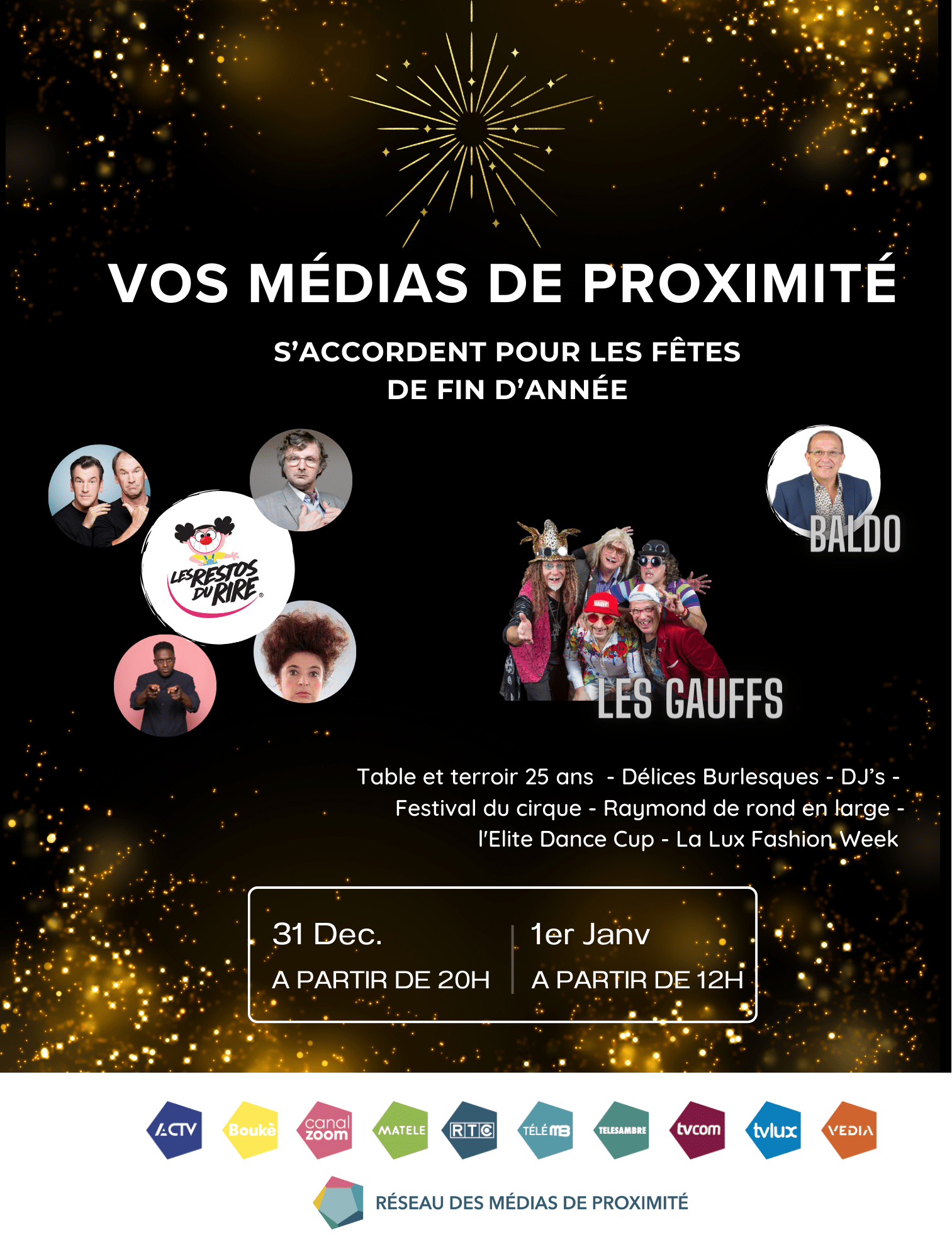 Le 1er janvier dès 12h, on prend l’apéro avec Baldo. Le début de l’année est l’occasion de ré-ecouter les chansons les plus porteuses d’espoir et d’amour du répertoire. C’est ce que Baldo propose dans cette émission spéciale où il est rejoint par les meilleurs interprètes de l’émission « Baldo Chansons Souvenirs ».  On enchaine avec le « Festival du cirque », le Cirque de Namur réunit de nombreux artistes du monde entier pour le plus grand plaisir des grands et des petits. Un show de sons, de lumières et d’artistes en tout genre venus des quatre coins de l’Europe, des plus grandes écoles de cirque . A 14h30, « Raymond de rond en large ! » retrace la vie de Devos à travers le jeu d’artistes liés de près ou de loin au maître du jeu de mot : Elliot Jenicot, Les Founambules, Manon Lepomme, Les Frères Taloche, Etienne Serck, Fabian Le Castel, des illustrations de Pierre Kroll, Laetitia Colinet (pianiste locale), Bruno Coppens en maître de cérémonie et d’autres artistes surprises ! On continue l’après-midi avec de la danse ! « L’Elite Dance Cup » a tenu toutes ses promesses avec une compétition de danses sportives de niveau international. Sur le parquet, plus de 200 couples se sont mesurés au tango, quick step et autre paso doble en fonction de leur catégorie. Et en termes de catégorie, on peut dire que l’Elite Dance Club, organisateur de l’événement, a frappé fort avec une première mondiale. Pour terminer ce programme de nouvel an, nous vous proposons « La Lux Fashion Week » de quoi vous donner quelques idées pour 2024.